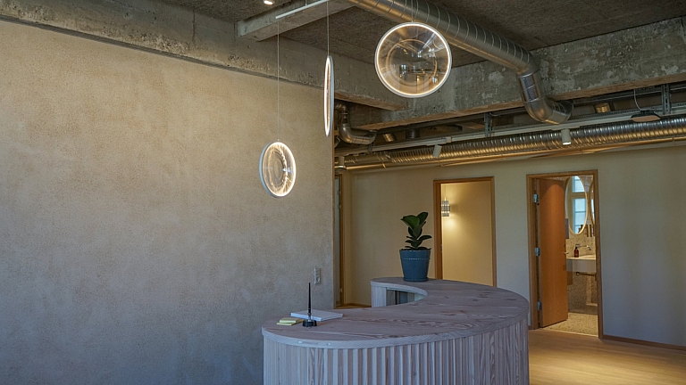 Upcyclet vægbeklædning – Til vægbeklædningen på det nye kontor er der brugt gamle korkpropper blandet med kalk. Det giver et godt udtryk og fungerer ikke mindst effektivt akustisk. Endelig er der brugt kalkpuds i stedet for maling i det meste af det nye kontor.